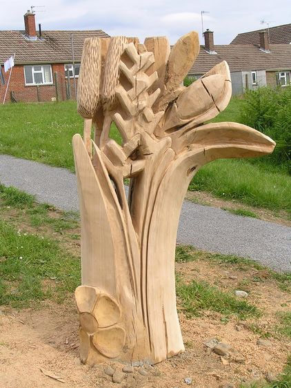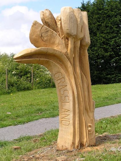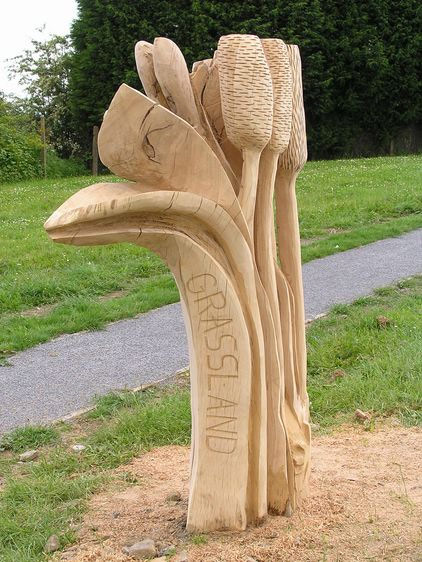 The Oak posts were designed to comprise of one or more of the floral species to be found in each specific habitat - Grassland, various grasses etc; working from a copy of the ecological survey that had been carried out in the park, to identify specific species.